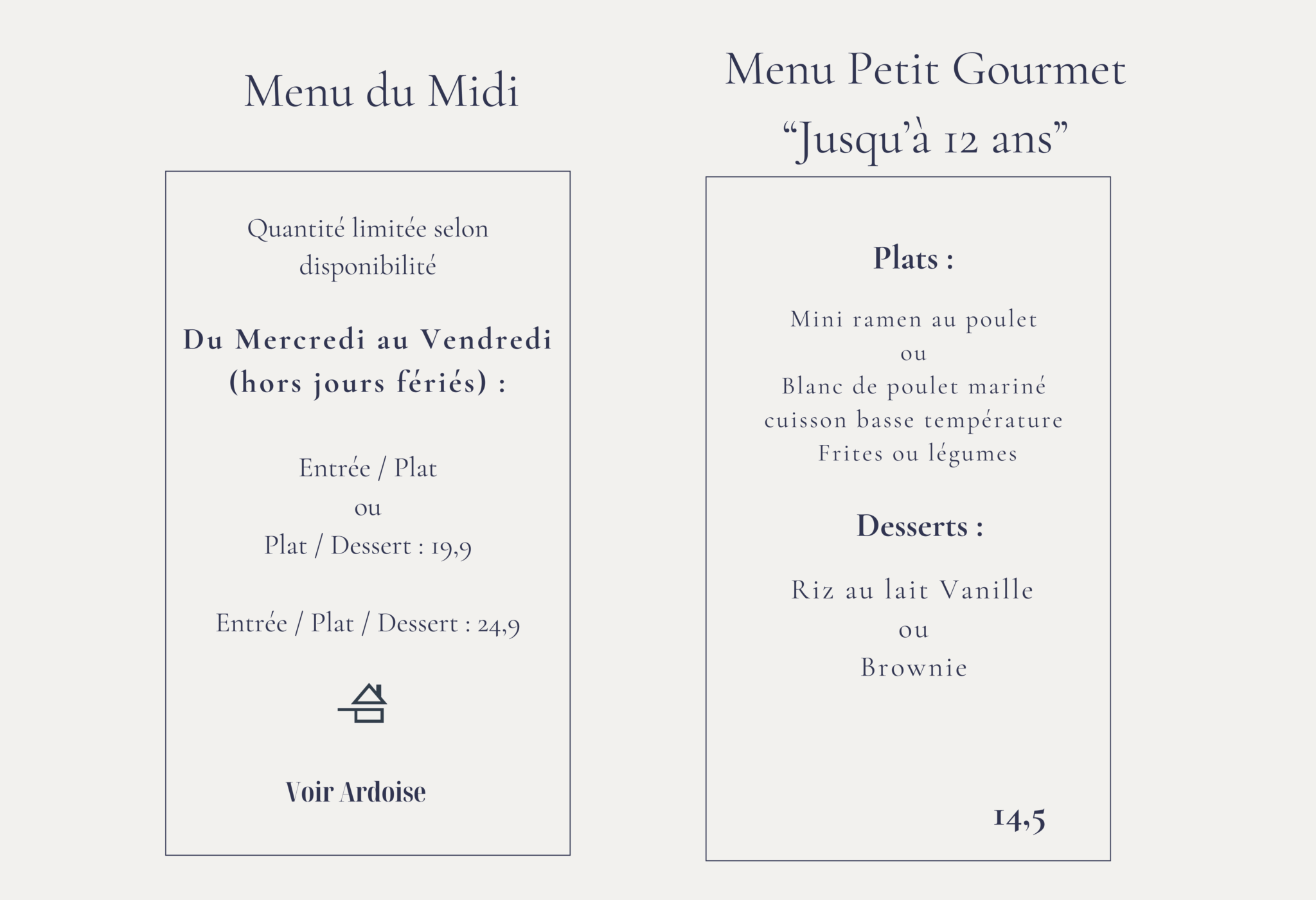 NOTRE CARTE Nous changeons notre carte régulièrement, au fil des saisons ENTRÉES Foie gras mi-cuit 19.9Marbré poivre de Kampot et gelée pineau des Charentes des fermiers GastronomesSoupe à l’oignon 9.5Gratinée au CantalPlanche de charcuterie 19.9Charcuterie SARL Talon Cantal, cochon Label Bleu, Blanc, CoeurTataki de truite 10.5Truite Gensac la palme ( mi-cuit) laitue de mer, vinaigrette mangue passionŒuf parfait 12.0Velouté de Potimarron, noisettes concassées et châtaignes Les Huitres Gaboriau 12/18/22Selon arrivage,Spéciale n°3 par 6, 9 ou 12, Ile d’OléronOs a moelle 10.5Frotté à l’ail et fleur de sel PLATS Le Burger du Chef 22.0Effiloché de porc, coslaw, salade , oignons crispyBavette tigre qui pleure 22.0Riz thaïRisotto de Fregula Sarda 19.5Fregula, grana padano et shiitaké Charentais de chez Cham BPoulpe snacké et encornets 29.0Polenta crémeuse, curable de chorizo et sauce chorizoRamen au poulet 21.0Nouilles de riz, bouillon dashi, oeuf à la coréenne, shiitaké Charentais de Cham B, blanc de pouletSalade Périgourdine 19.5Feuilles de chêne rouges, foie gras, magret séché maison, gésiers, cerneaux de noix, tomme de vachePavé de Turbot 38.0Cuit sur arrêtes, sauce verjus, purée façon Robuchon DESSERTS Poire Belle Hélène revisitée 11.5Riz au lait 9.5Caramel beurre salé et riz souffléMille feuilles 11.0 Vanille, caramel beurre salé et glace vanilleCafé gourmand 11.0 Trilogie de dessertsThe gourmand sup 1.5 Trilogie de fromage 10.0Selon disponibilité Du Mercredi au Dimanche 12h - 14ho0 / 19h - 22h00 1 Av. de Lattre de Tassigny, 16100 Cognac ITTINÉRAIRE Contact 05 45 36 31 03 atelierdesquais@gmail.com