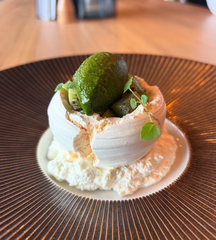 Pavlova Kiwi 9.5 Crème montée vanille, dôme de meringue, kiwi de chez Boinaud et sorbet roquette citron vert